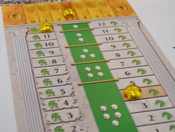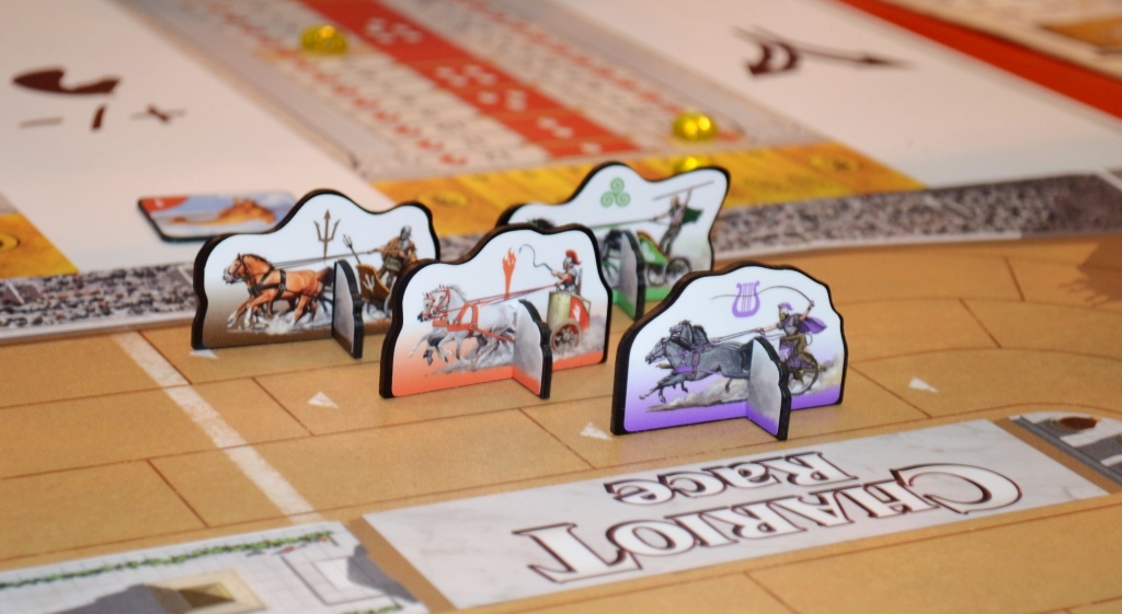 Понравилась фишка с манёвренностью. Дело в том, что количество кубиков на ход определяется по специальной табличке и напрямую зависит от состояния колесницы. В общем, неплохой быстрый филлер, гонять нужно всего два круга.