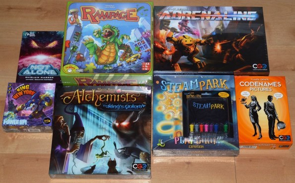 Not Alone, дополнения к King of New York и Алхимистам для друзей. Доп к Steam Park и фигурки роботов для Кати. Rampage с math trade-а – подурачусь и обменяю потом дальше 🙂