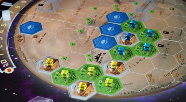 Terraforming Mars эксплуатирует популярную ныне тему колонизации Марса, а именно, изменение климатических условий планеты с целью сделать её пригодной для жизни. Первый интересный нюанс заключается в том, что игроки сообща стараются поднять до максимума три основных показателя: температуру, уровень кислорода и запасы воды. Когда все три условия выполнятся, партия завершится. То есть, по сути, участники могут влиять на оттягивание концовки.
