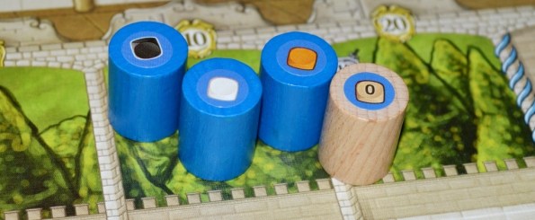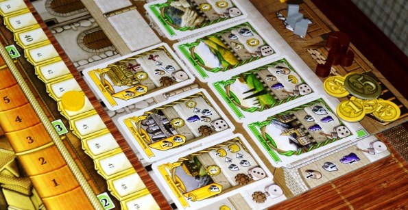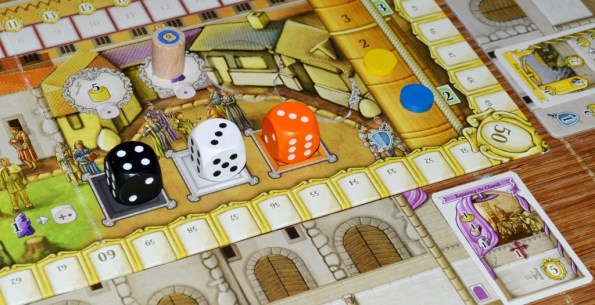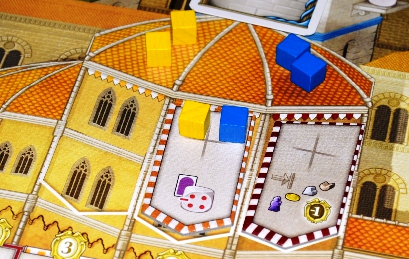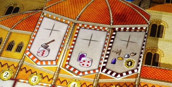 Те же самые кубики с минимальным требованием силы нарисованы на поле рядом с каждым действием. Хочешь занять местечко с пятью точками, будь добр, посылай фишку со значением пять или выше. Ленивых же рабочих можно подбодрить фишками слуг, они тут наподобие верблюдов из Марко Поло: каждый слуга увеличивает силу рабочего на 1.