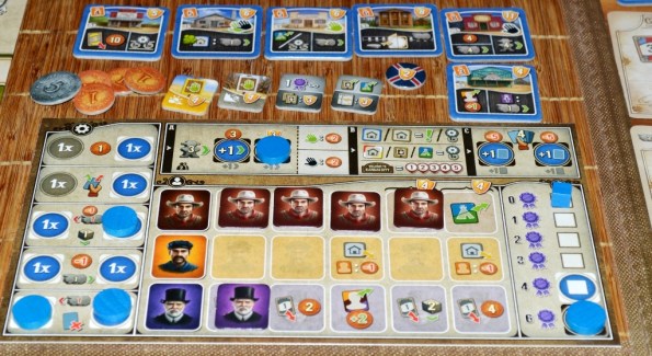 В центре расположены треки помощников, которые нанимаются с рынка труда. Заполнение определённых ячеек даёт одноразовый бонус, а прокачка данных треков принесёт дополнительные победные очки.