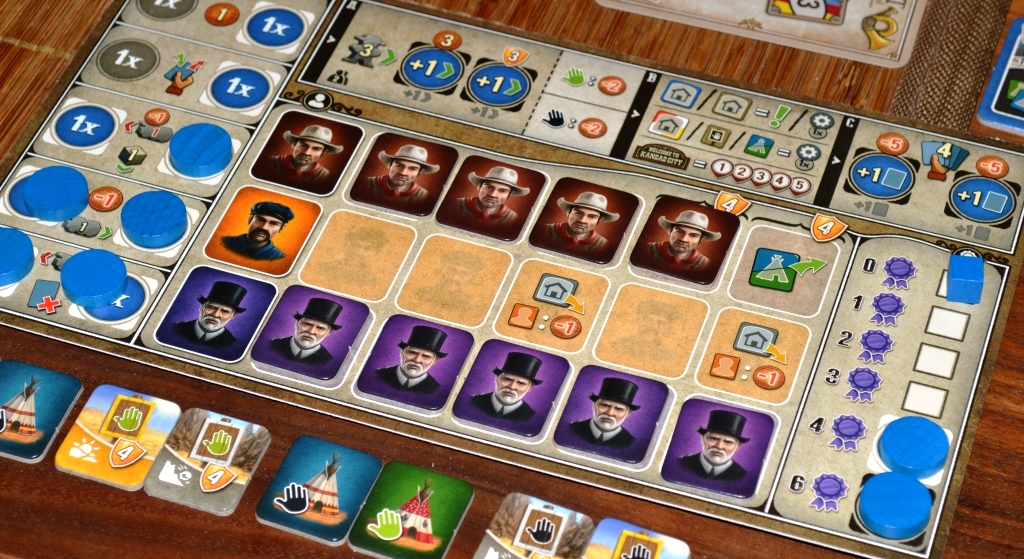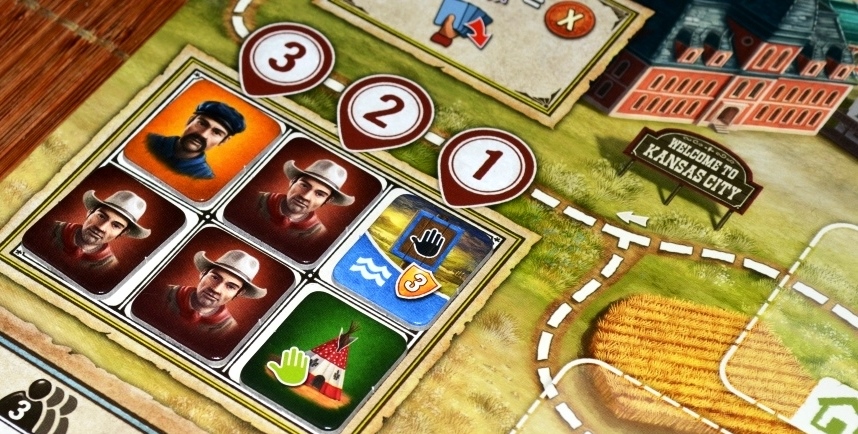 Заканчивая тему продажи стада, хочется добавить, что добравшись до Канзаса, игрок ещё выбирает, какие три жетона помощников, преград или вигвамов добавить на поле, после чего заполняет освободившиеся ячейки “предсказания” новыми жетонами. Попав на рынок труда, помощники постепенно заполняют ряды один за другим, сдвигая специальный маркер окончания партии. Как только маркер пересекает жёлтый символ, это означает, что рынок коров следует пополнить. Ну, а если маркер “слетает” с поля, то партия заканчивается.