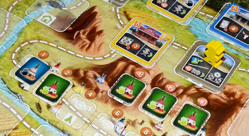 Пару слов о преградах и индейцах. Жетоны камнепада, засухи, наводнения и вигвамов удлиняют путь (ведь они тоже являются локациями) и затрудняют доступ к более вкусным местам под строительство. Дело в том, что за этими участками располагаются ячейки под здания с дополнительным бонусным эффектом. Символы рук на преградах и вигвамах обозначают пошлину, которую следует платить игроку при остановке или пересечении данной локации. К слову, на некоторых персональных зданиях тоже имеются руки. Но если пошлины за преграды идут в банк, то в случае со зданиями – отдаются хозяину.
