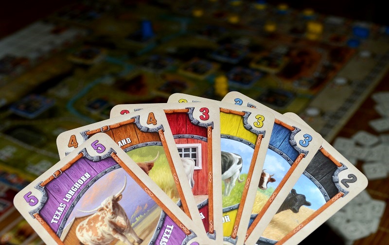 Как же снять все эти диски? Как только пастух доходит до Канзаса, то он тут же получает возможность продать набор уникальных коров, имеющийся у него на руках к концу перегона. Ценность стада равняется сумме цифр карт разного цвета.