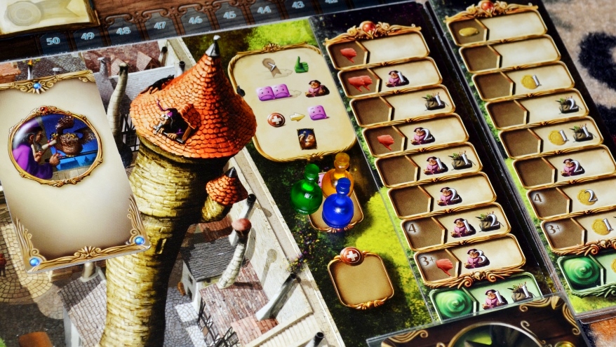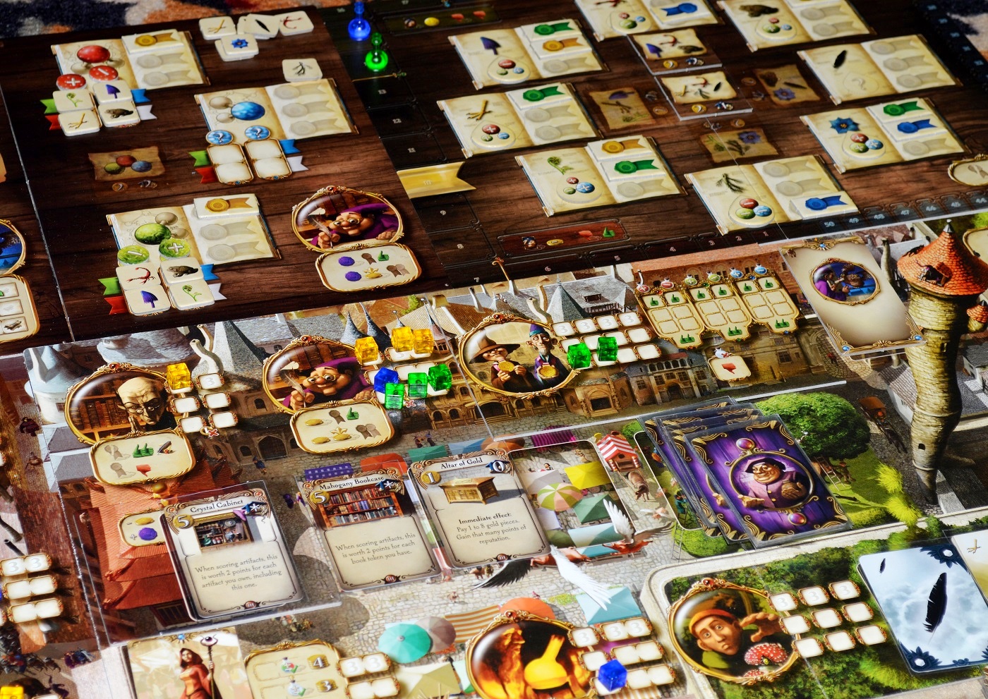 • артефактами – да-да, вы не ослышались, если повезёт, то начнёте игру сразу с сапогами-скороходами! Есть две карты, которые дают артефакты. Первая разрешает взять любой из невыбранных на игру артефактов первого уровня, потеряв при этом до семи очков (зависит от стоимости артефакта). Вторая карта с артефактом позволяет взять невыбранный на игру артефакт третьего уровня, не показывая его остальным игрокам до финального подсчёта. При этом вы можете дополнительно получить до четырёх очков репутации (зависит от стоимости артефакта).