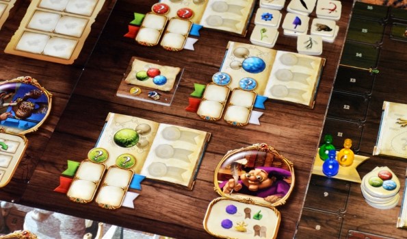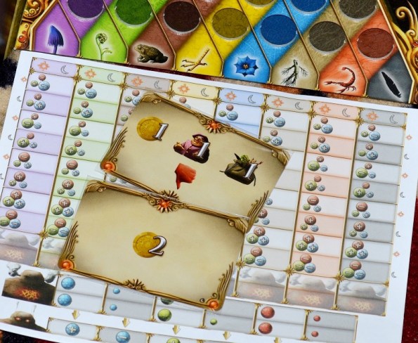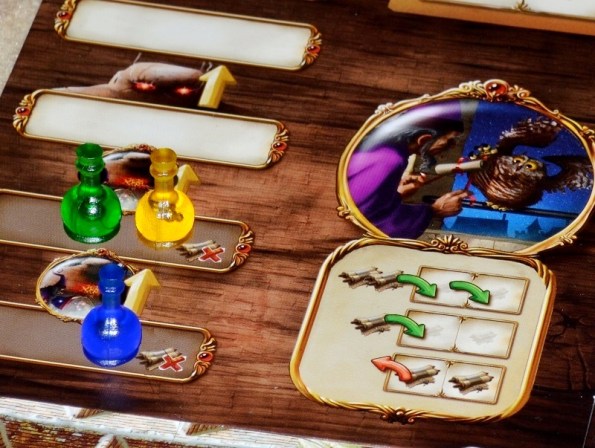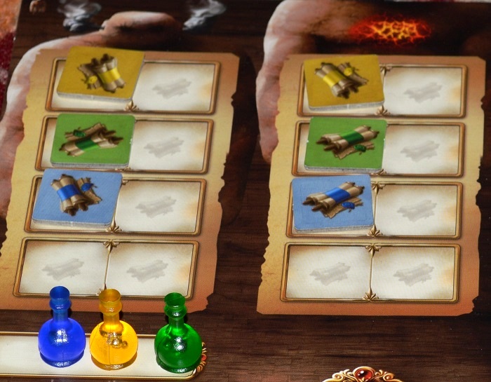 В приведенном выше примере для оживления голема необходимы красный положительный элемент и зеленый отрицательный. Есть только две формулы (всегда только две), которые содержат оба этих элемента одновременно. Смешав ингредиенты с этими формулами, получаем здоровенького голема. Оживление голема приносит 5 очков в конце игры и 3 во время второй конференции.