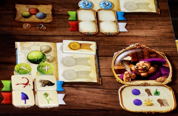 Теперь же, используя действие публикации теории, мы выбираем цвет, о котором будем писать (в нашем примере синий). Далее берём два жетона результата с полярностями, то есть, жетоны с синим плюсом и синим минусом (теория также может быть и о двух плюсах или двух минусах), и кладём их в специальные ячейки на поле энциклопедии. Затем выбираем по два ингредиента для каждого результата и размещаем их на поле (перо и скорпиона под жетоном синего плюса, корень мандрагоры с лягушкой под минусом). Как всегда, закрепляем свою теорию печатью.