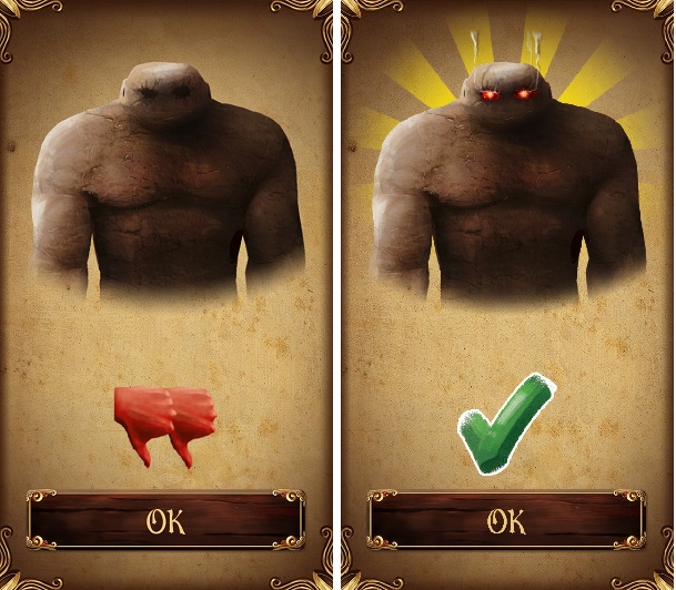 Для эксперимента в приложении выбирается ингредиент, который мы хотим скормить голему (он должен быть на руках и после эксперимента сбрасывается). Приложение выдаст одну из возможных реакций подопытного: