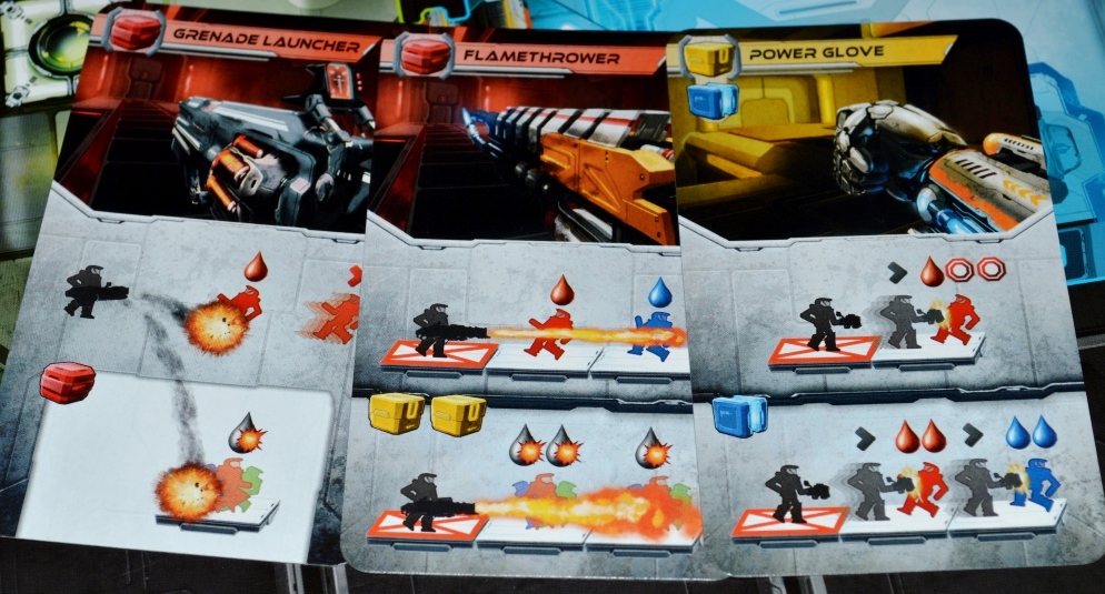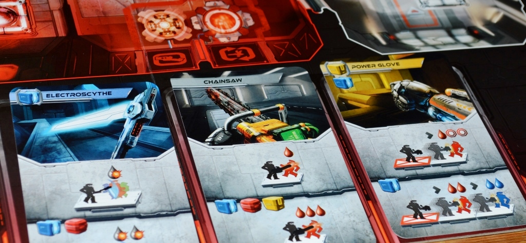 Рядом с каждым местом распауна выкладывается по три карты оружия. Оружие изобилует хитроумными пиктограммами, которые во время первых партий вас буквально замучают. Местами такое выразительное иллюстрированное объяснение даже вызывает улыбку, но вот все нюансы эффекта не поясняет, так что всё равно большая часть оружия потребует обращения к памятке. Вот такая “псевдо-языконезависимость”.