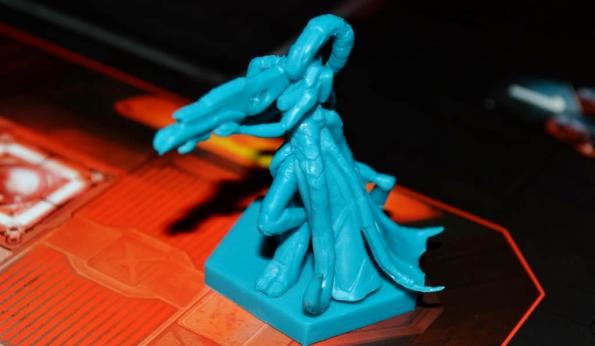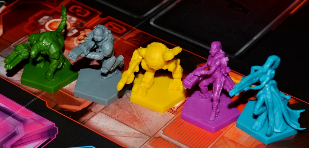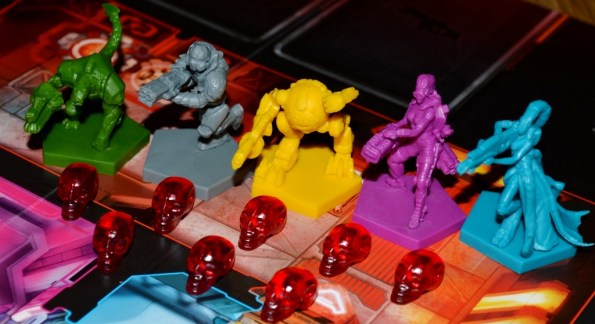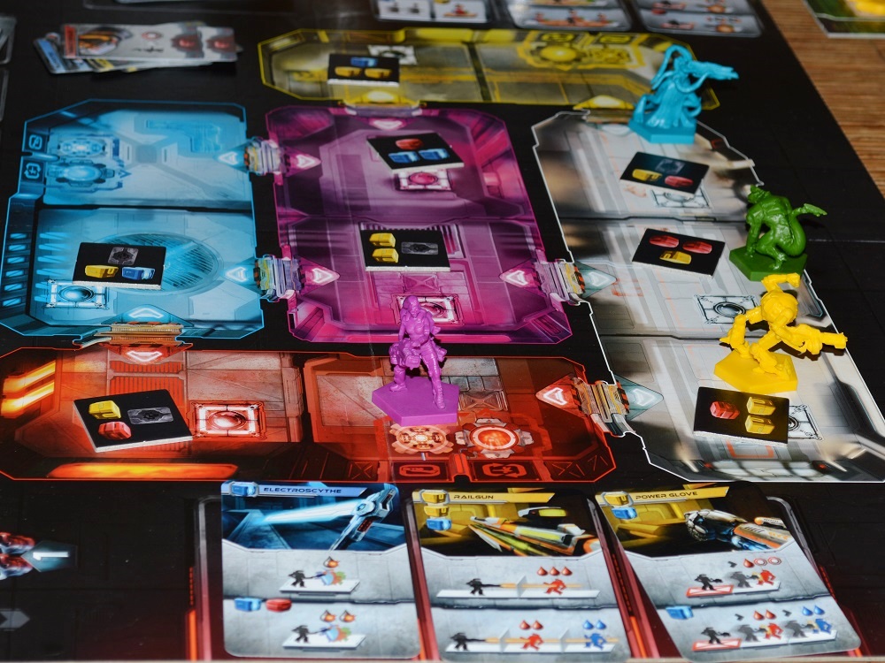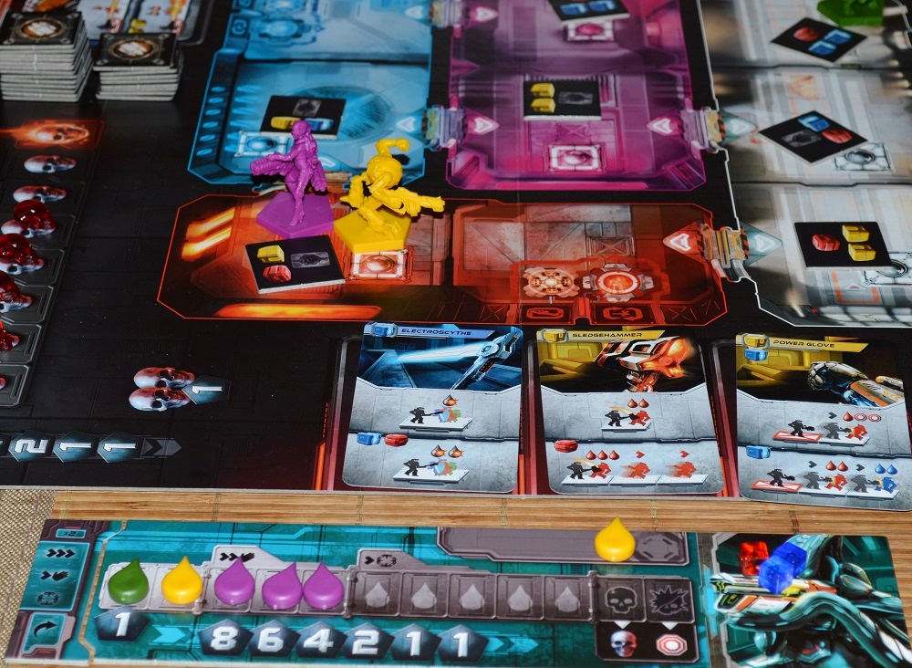 Как и полагается, тут есть всякие мечи и молоты для ближнего боя, и разные ракетницы, лазеры для дальнего. Многие пушки поражают сразу несколько целей, перемещают фигурки, навешивают жертве специальные метки. Метки – это нечто вроде знаний о сопернике. Во время следующей успешной атаки все метки вместе с ранениями отправляются на трек здоровья.