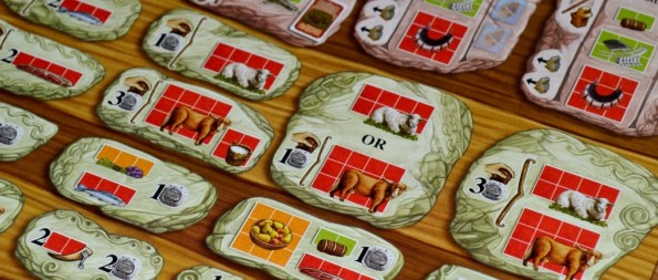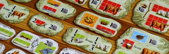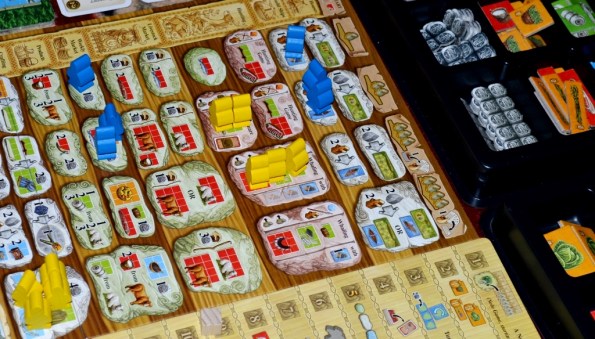 Минусы на зданиях закладываются не только тайлами (кстати, тут в ход идут и красные, и жёлтые), но и ресурсами, а сами здания помимо очков приносят ещё и товары. Но самое рискованное вложение – это поле новой территории, где тоже достаточно негативных очков. Выгода такого поля в том, что кроме добычи ресурсов и товаров тут легко повысить доход (меньшая площадь квадратов). А уровень дохода в конце тоже прибавляется к финальному результату. Да, забыл сказать, что партия длится семь раундов (есть короткий вариант на шесть).