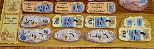 Эмиграция. Специальное действие, которое позволяет перевернуть корабль на сторону с более вкусными очками и положить его на место пира, тем самым снизив количество требуемой провизии во время кормёжки рабочих.