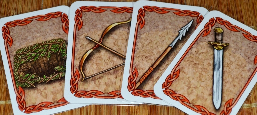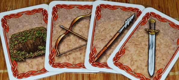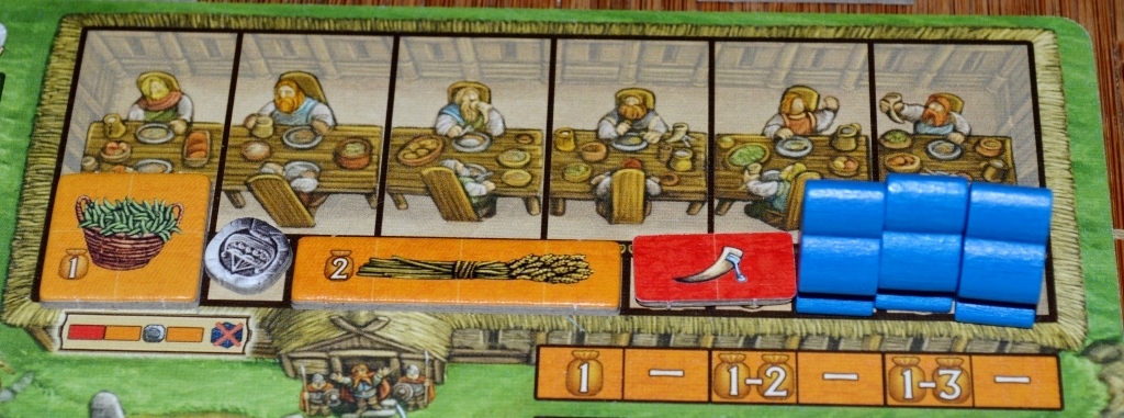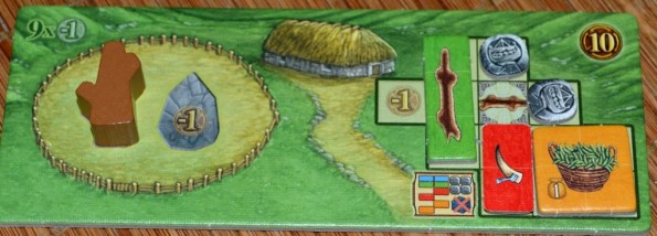 Каждому достаётся домашний планшет, фишки рабочих и стартовый набор, состоящий из тайла медовухи, трёх карт оружия и одной карты занятия.