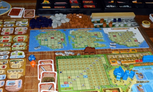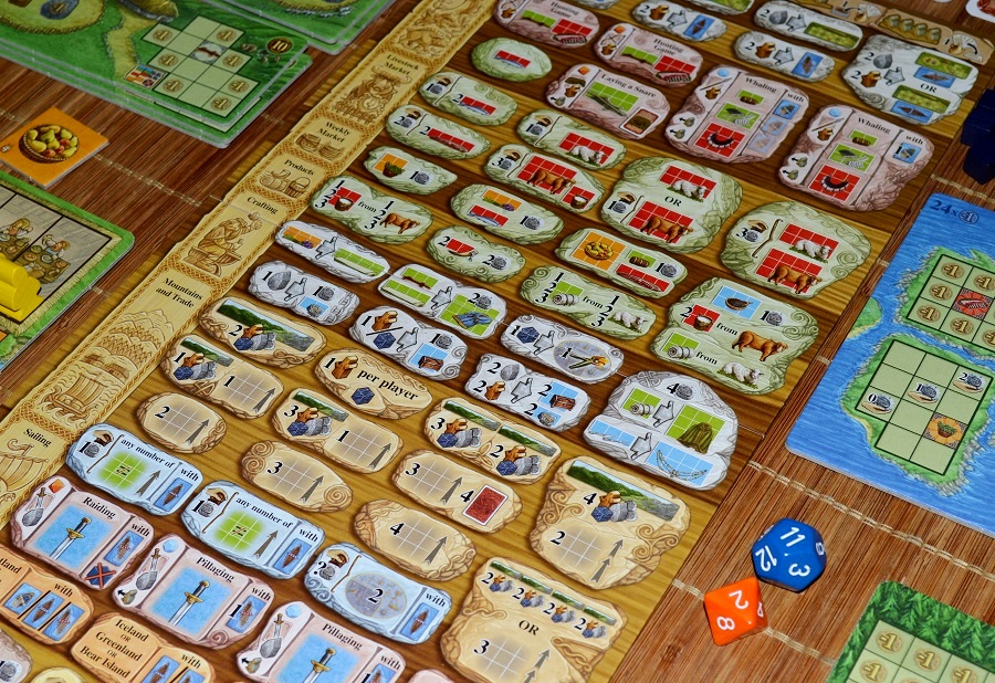 В центр стола помещается поле выбора действий, а рядом помимо поддонов выкладываются две колоды (оружия и занятий), тайлы зданий, новых земель, источников ресурсов, а также другие вспомогательные поля для лодок и специальных ценных товаров.