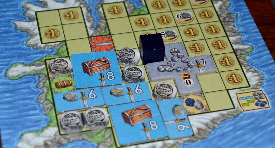 Набеги и грабежи. Похоже на охоту, только тут, наоборот, нужно накинуть, как можно больше. Тоже три попытки, а значение повышается камнем, карточками мечей и рудой, которая хранится на корабле (без кораблей нападать нельзя). Полученный результат тратим на синий или серый тайл.