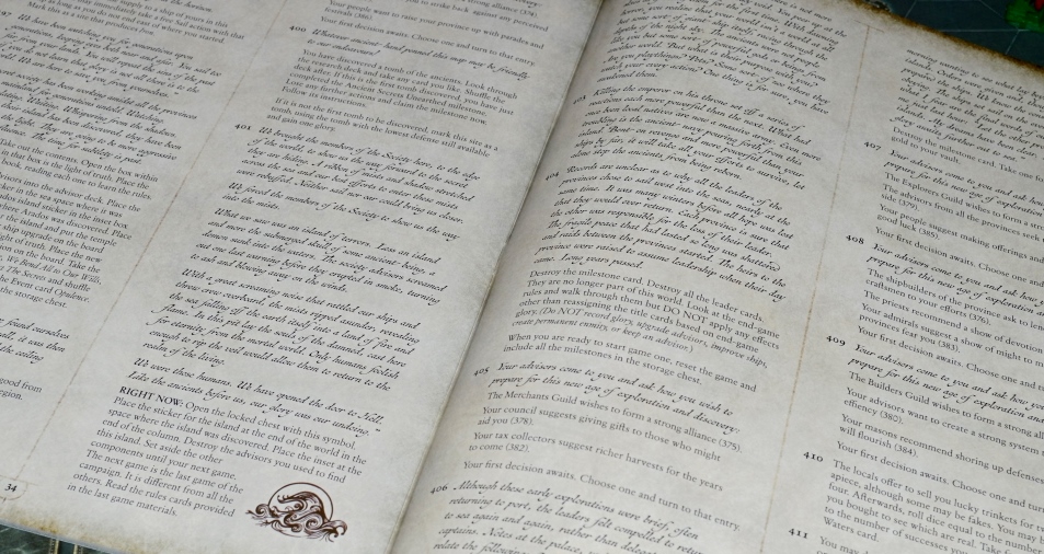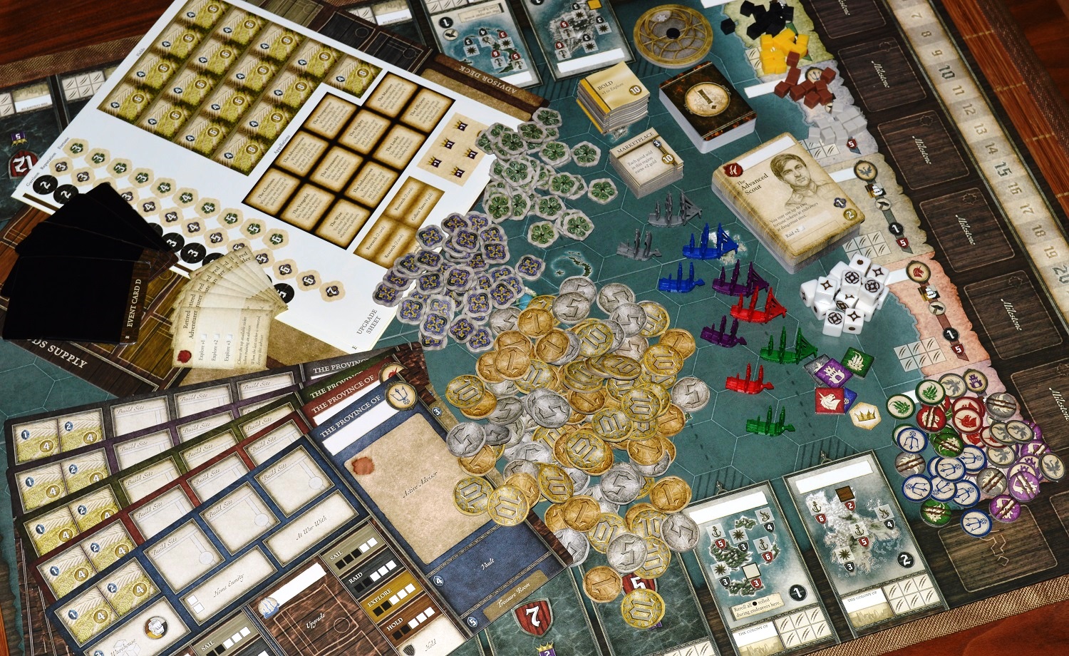 Сердце игры – это, разумеется, legacy-компоненты. По части наклеек, тут всё в порядке: это и свойства для советников/лидеров, и улучшения для планшета провинции, и новые острова, и многое другое. А вот карточек только четыре штуки – видимо, это какие-то ключевые события.