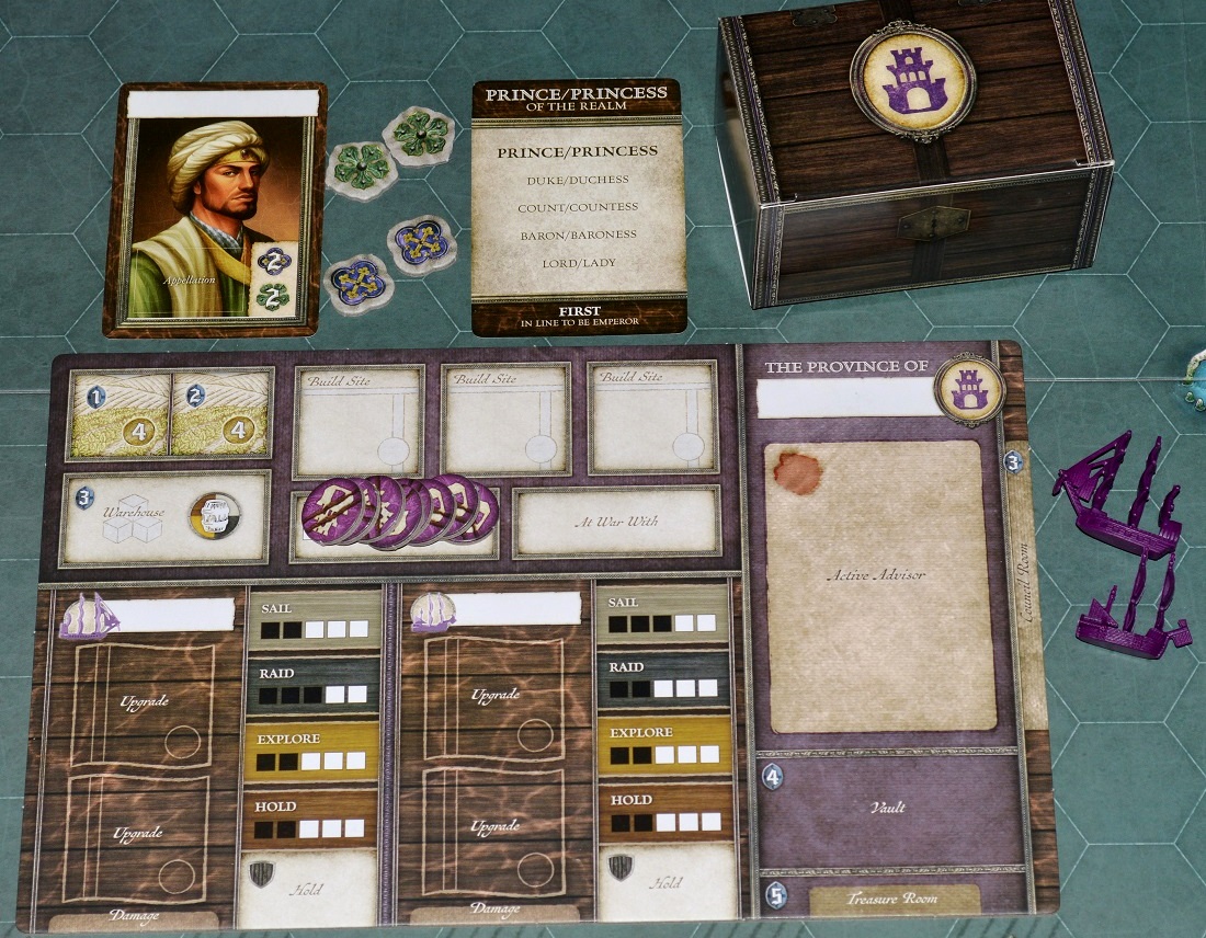 Помимо кораблей на старте каждому игроку достаётся планшет провинции, карта лидера, титул, а также набор жетонов враждебности, удачи и репутации.
