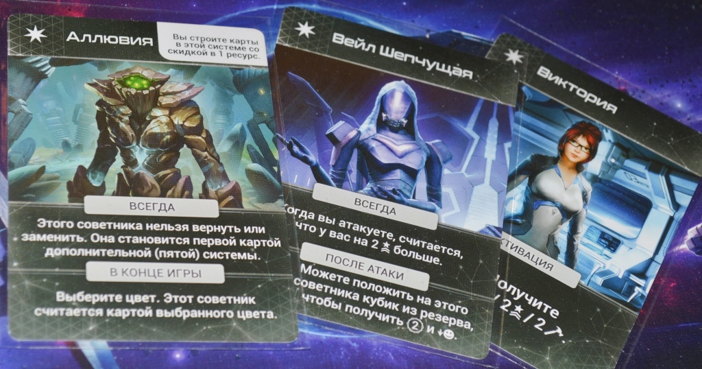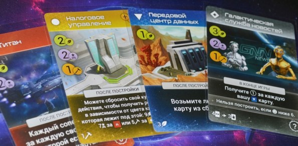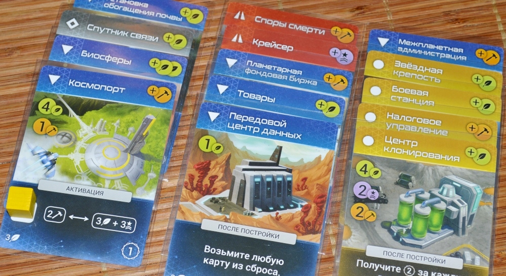 Пока мы не сыграли. Эххх… На мой взгляд, игрушка получилась пресной. Идеи, которые выглядят самобытно и интересно, безбожно урезаны и слишком поверхностны, а сами свойства карт – до боли скучны и неравноценны. Если первая партия заставила шевелить мозгами, что-то там думать и прикидывать, то уже вторая превратилась в унылое ожидание прихода наиболее вкусных по очкам карт (если не изменяет память: за кол-во построек в системе; да на активацию, где ПО также дают за определённые типы). Кстати, играя, всё время задавался вопросом, почему тут такой пессимистичный космос, что за многие карты дают ноль очков. Разве нельзя было сдвинуть шкалу, чтобы всё приносило ПО, на радость-то игрокам, инвестирующим дорогие ресурсы в постройку. Опять мысли вслух.