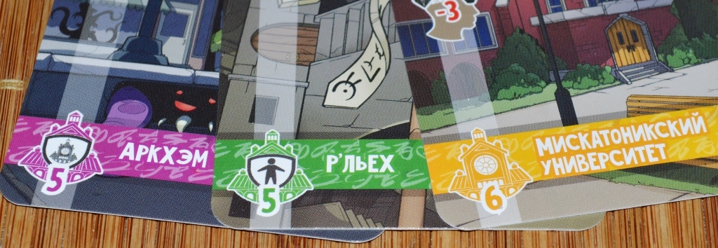 Перекочевали сюда и локации/здания, охраняющие игрока и дающие постоянные плюшки. Эти карты остаются в игре до уничтожения. Если одни локации можно игнорировать, то так называемые убежища придётся обязательно сломать, прежде чем добраться до рассудка соперника. Есть ещё и третий тип, именуемый вратами, они “крышуют” другие локации – лишь разрушив все врата, игрок вправе атаковать прочие эшелоны защиты.