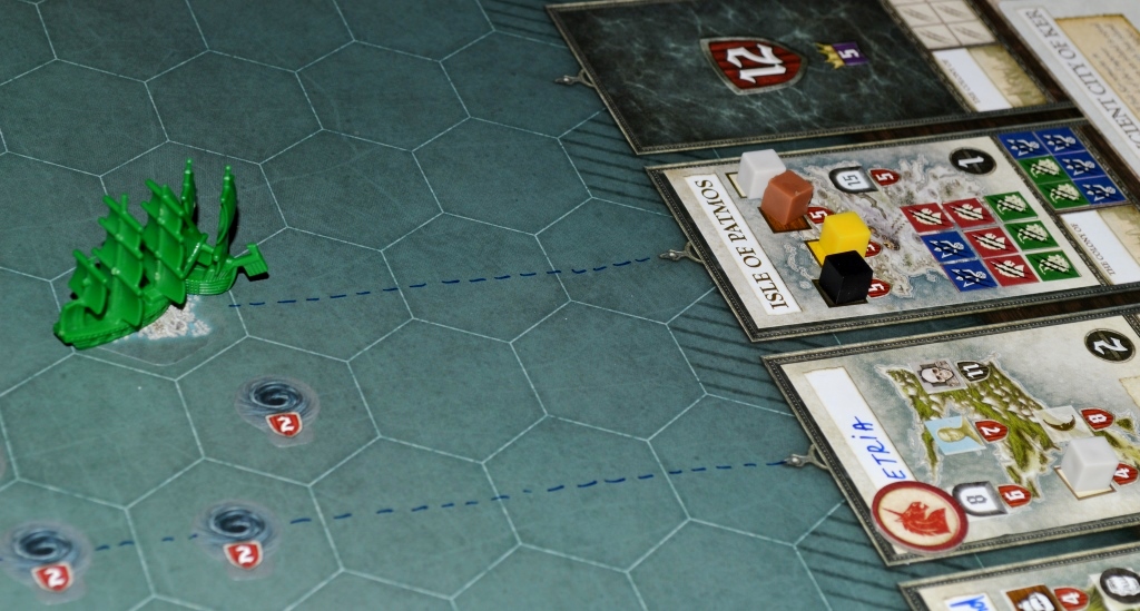 Итак, напомню, что враждебно настроенный остров Патмос прикрыл нам “лавочку”. Покупать товары с ним стало дорого, а совершать рейды опасно. Поэтому в девятой партии мы пустились в свободное плавание. В основном, занимались исследованием гробниц и поиском кусочков карт в колоде технологий. Жетоны репутации и удачи старались экономить, чтобы в конце содрать побольше наклеек с Патмоса.