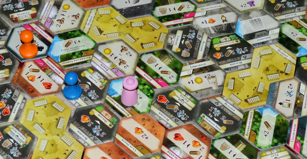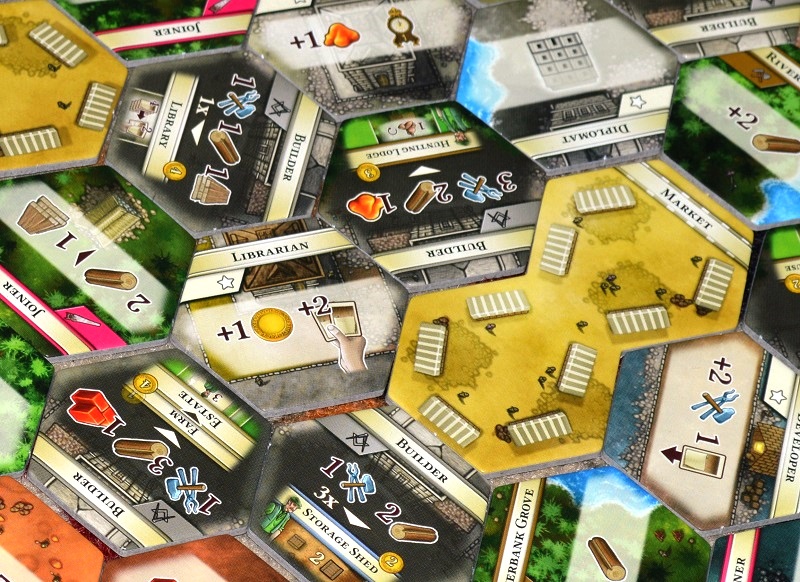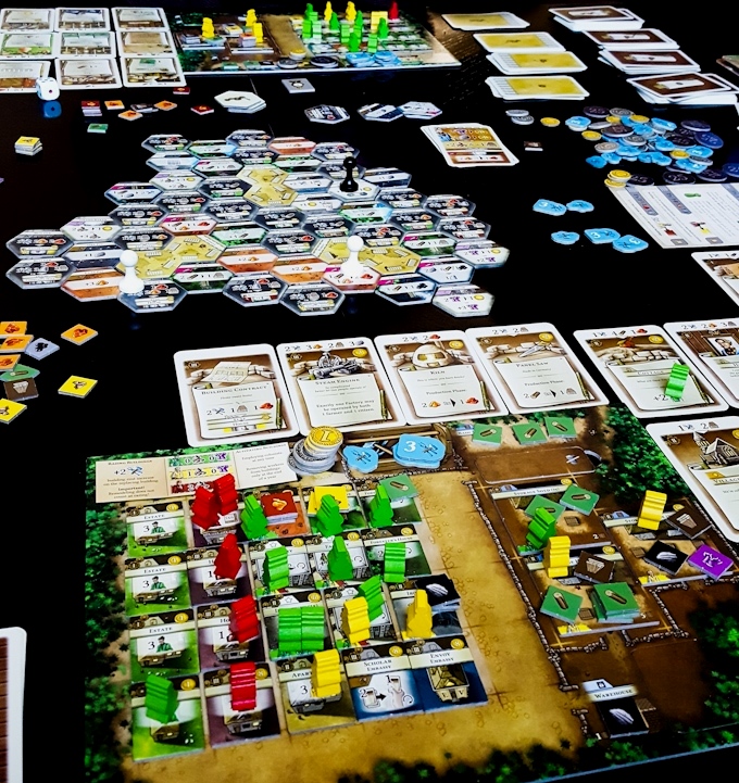 Оригинальностей тут не много. Ключевая заключается в составном поле действий, состоящем из гексов, по которым передвигаются пешки-прорабы игроков, пользуясь благами локаций. Изначально оно формируется из 12 тайлов, но с каждой эпохой заметно прибавляет в размере.
