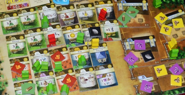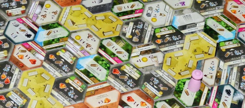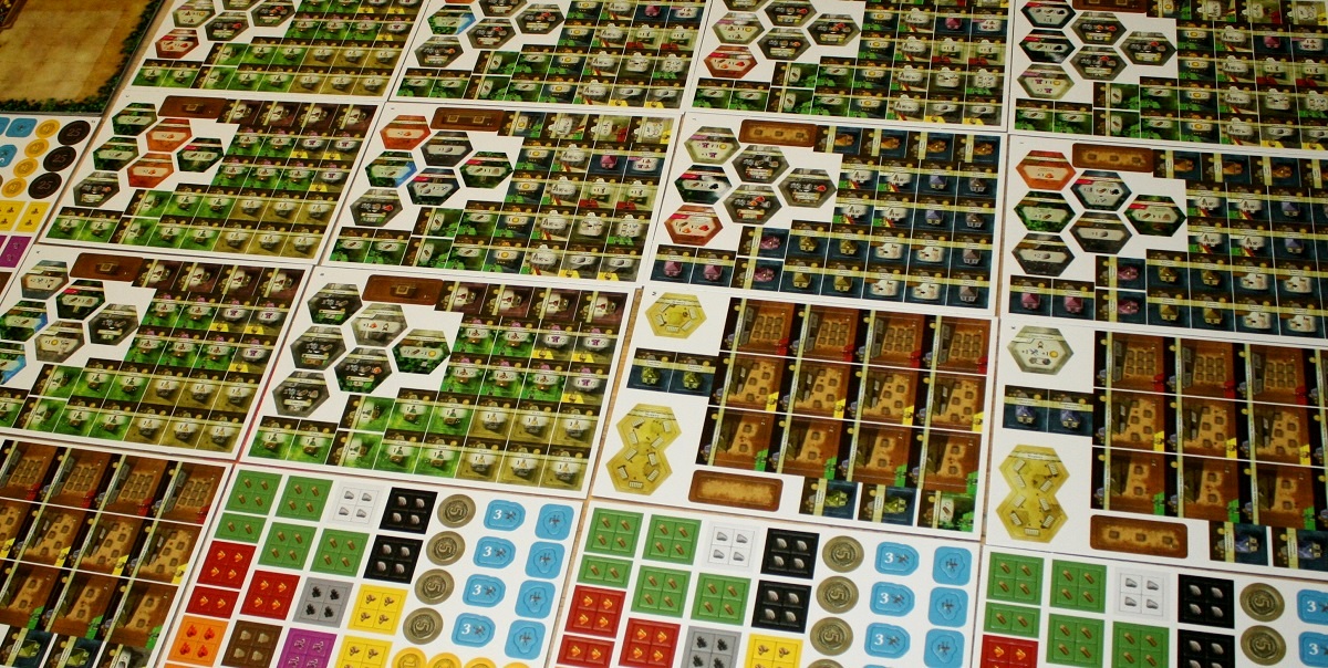На лицо эпичность и в количестве добра внутри коробки. Куча деревянных фишек фермеров, ремесленников и горожан; гора картонных жетонов ресурсов, тайлов зданий и локаций; толстенная колода карт улучшений – всё это поначалу вводит в ступор, ибо довольно сложно придумать, как оптимально рассортировать компоненты, чтобы после сетапа остались силы на саму игру.