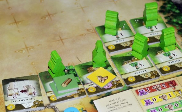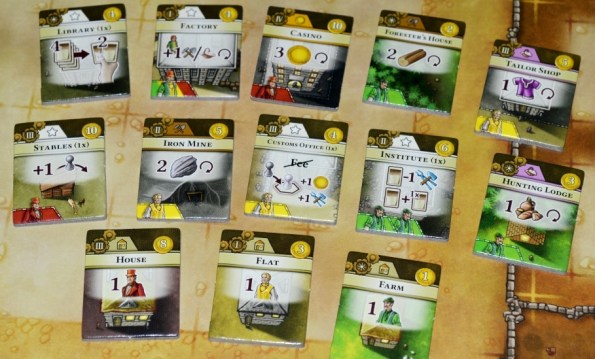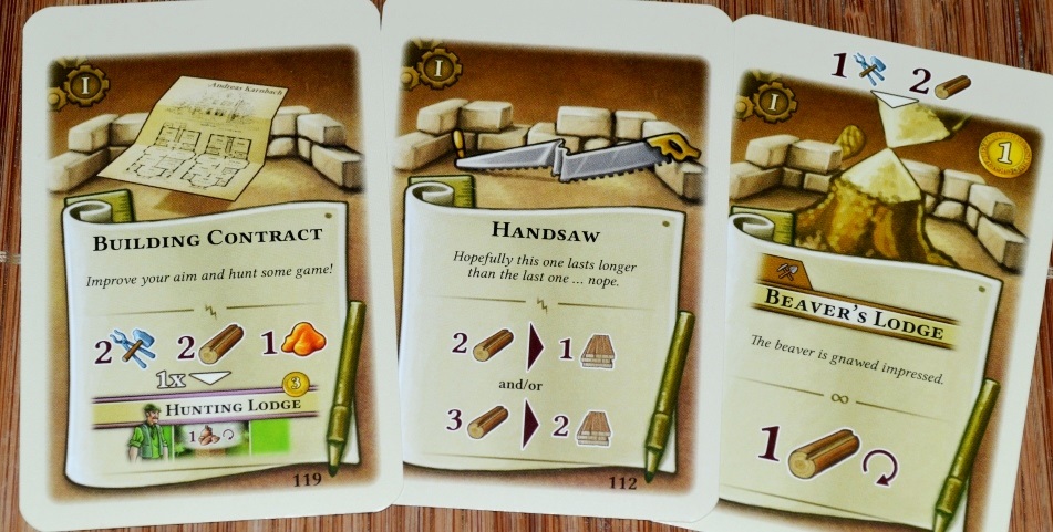 Карты улучшений по типам сильно напоминают занятия из Feast for Odin, они могут давать сиюминутные, постоянные, или лимитированные по количеству использований бонусы (дополнительные ресурсы, возможность дальше передвигать прораба и т.п.). К сожалению, баланс карт хромает. Есть много интересных и полезных, но частенько попадаются откровенно слабые и даже абсурдные. Мы так и не поняли, зачем в колоде столько карт на обмен дорогущих товаров на жетоны инструментов (требуются для постройки зданий), если эти инструменты производятся каждый год, и их вроде всегда хватает.