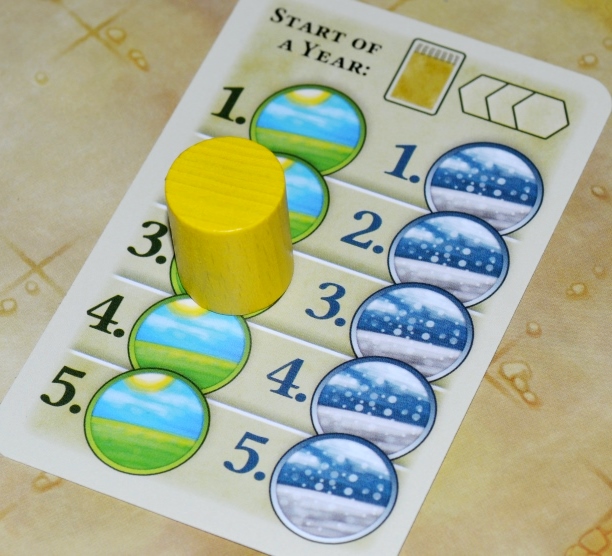 В конце года первый игрок пристраивает ещё 3 гекса к центральному полю, производственные здания (если в них сидят трудяги), генерят плюшки, а рабочие требуют еду (а самые продвинутые ещё и одёжку).