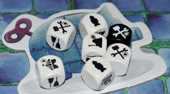 Кубик шпионажа. Чёрный кубик добавляется к обычным белым. Чтобы им воспользоваться, следует заплатить 4 бакса. Но! Игрок получается скидку в 1 бакс за каждый кубик с таким же символом у соседа справа. Получается, если внимательно следить за соперником, то можно шпионить даже бесплатно.