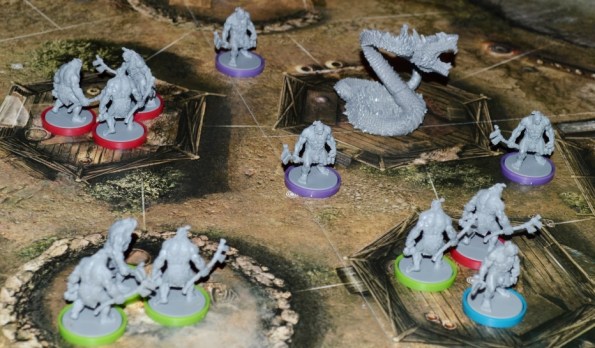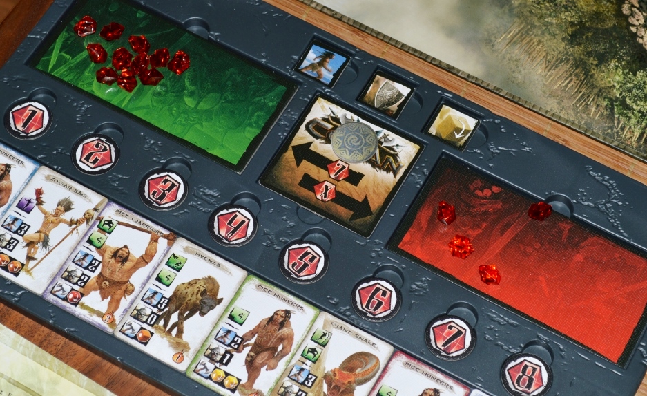 Река оверлорда – это, безусловно, крутая идея. Этакая панель управления врагами, которая наглядно показывает все их способности/стоимость и одновременно балансирует возможности зла, чтобы оно не могло долбить героев одними и теми же монстрами. Освоившись с рекой, оверлорд может искусно планировать свои активации и вовремя их удешевлять, сбрасывая с реки тайлы почивших отрядов.