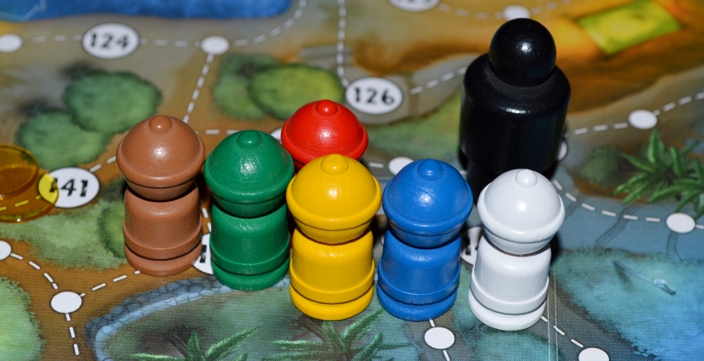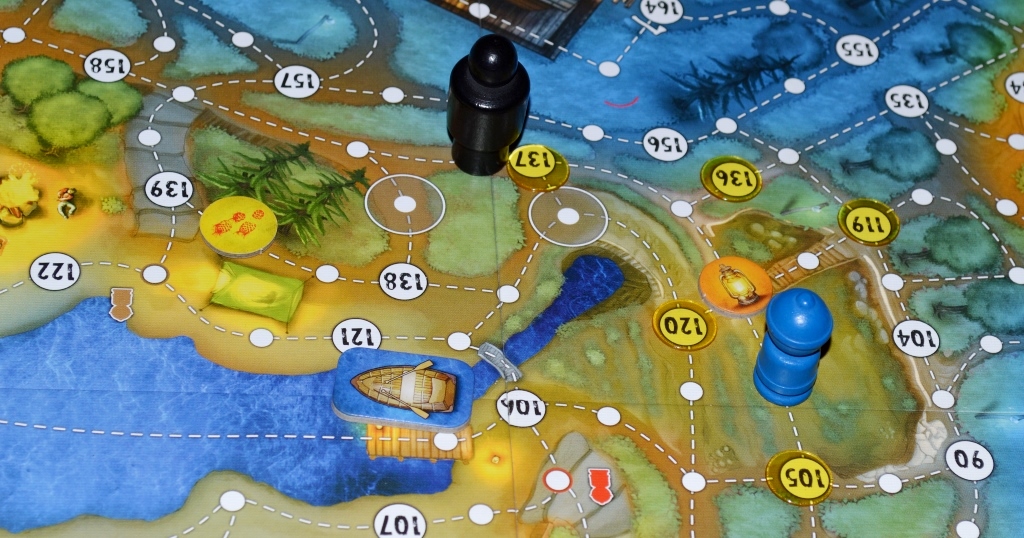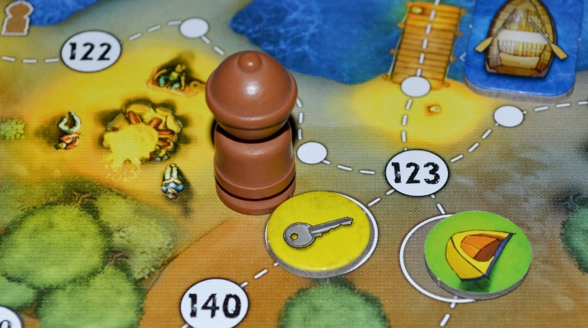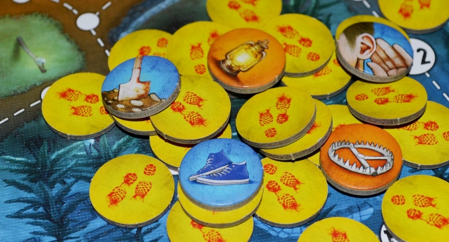 Стоит отметить, что игрок не может иметь два одинаковых жетона (и два ключа тоже). Если игрок находится на точке с жетоном следа или жетоном палатки, то он может посмотреть, что там, и, если у него такого жетона нет, взять его себе. И тут появляется немного странное правило: если такой жетон у игрока уже есть, то его следует положить на ближайшую незанятую точку. И тут игроки могут начать играть в футбол с вещами, «перекатывая» их друг другу.