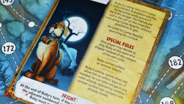 Отдельного упоминания заслуживает промо персонаж Buby. Это собака, которая забрела на территорию лагеря в поисках вкусняшек. Любой игрок в момент выбора персонажа может взять Buby. У собаки есть отрицательное свойство – она не может подбирать и использовать полезные жетоны и ключи, что вполне логично. Зато, если после движения Buby маньяк оказался рядом, то он обязан вскрыться. Buby не самый смелый пёс, поэтому после столкновения с маньяком он поджимает хвост и двигается на соседнюю точку.