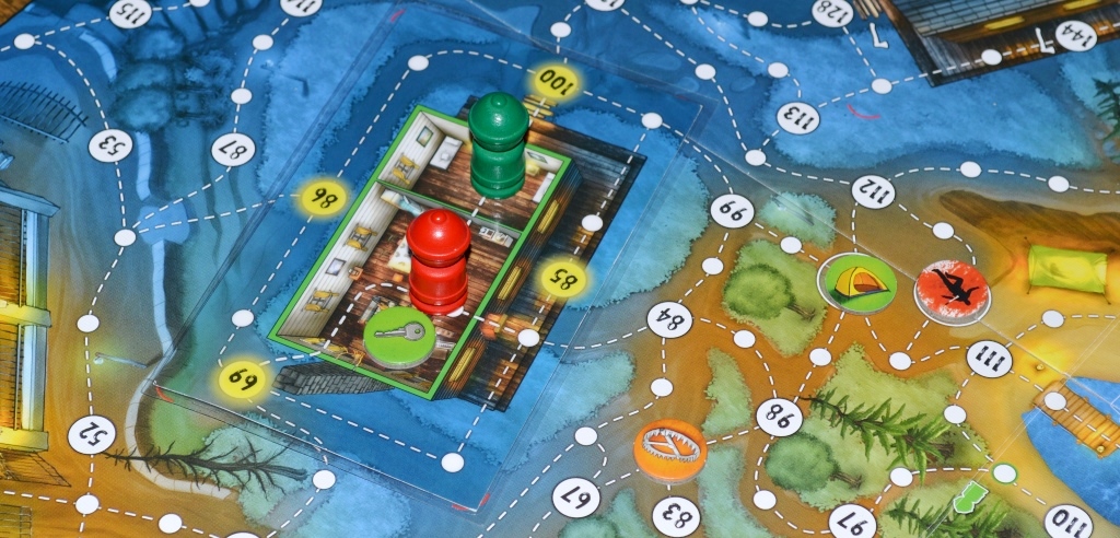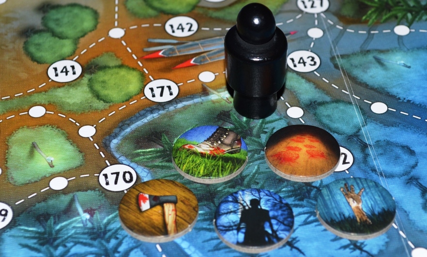 Игровое поле расчерчено тропинками и дорогами, по которым перемещаются игроки. Маньяк может ходить только по кружкам с цифрами, преодолевая расстояние быстрее героев, которым приходится красться по белым точкам. Также на поле имеется пять хижин, расположенных вокруг озера. И хижины, и озеро не просто элементы дизайна – они имеют свою механику.