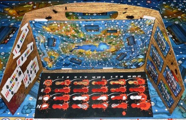 В начале игры маньяк получает ширму, за которой скрывается трек, где он отмечает свои перемещения. Также ширма содержит краткие правила для каждой главы (ах да, партия представляет собой мини-кампанию, разбитую на четыре сценария-главы, правила и цели которых немного отличаются), уменьшенное игровое поле, схемы сломанных хижин (хижины могут быть закрытыми, открытыми, либо сломанными), и очень прикольную деталь – прорезь для глаз, сквозь которую можно изучать игровое поле, не выдавая себя. Делать это не очень удобно, зато можно легко поднять настроение остальным. Кстати, в предзаказе игры в комплекте шла хоккейная маска. Видимо для тех, кто сразу не понял, откуда позаимствован сюжет. Ну, и для создания атмосферы, конечно.