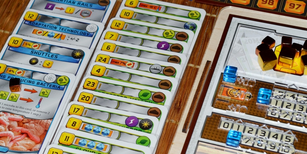 В TM вот всё прям хорошо. Классное планирование, вариативность огромная. Интересно играть за любую корпорацию, пробовать новые связки карт. Мне вот нравится озеленять и выполнять цели, а товарищам – разводить животных и поднимать параметры через свойства проектов. Недавно неожиданно открыл для себя, что в игре можно победить, не выложив ни одного леса.
