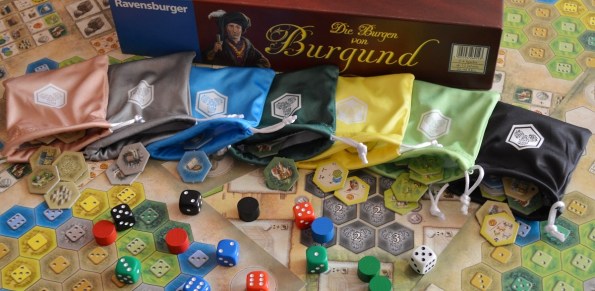 Бонус: пришли сегодня мешочки для тайлов из Замков Бургундии. Заказывал их на BGG Store. Достаточно миленькие с виду, я доволен.