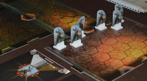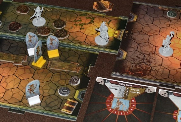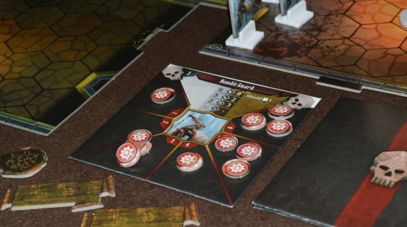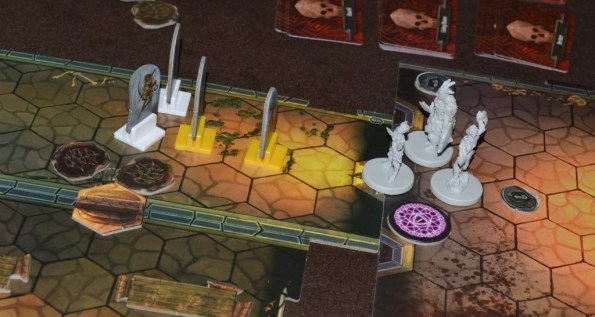 Если говорить о врагах, то понравилась идея с конвертами для квадратных карт с характеристиками. Конверты оставляют видимым выбранный уровень сложности монстра и одновременно являются местом для хранения жетонов ранений и прочих статусов. Допустим, если ранили третьего скелета (на одинаковых жетонах врагов имеются циферки), то раны кладутся на соответствующее деление. Достаточно удобно, плюс избавляет от загромождения поля.