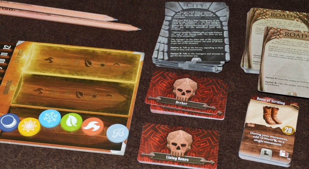 Ну и завершим тему активации героев элементами стихий. Это ещё одна дополнительная фишка, которая может улучшить эффект выбранного действия. Жетончики стихий располагаются на отдельном поле-треке. Каждый раз, когда игрок использует карту с символом элемента, то соответствующий жетон переходит в колонку strong. В дальнейшем “заряженные” элементы можно применять для свойств определённых карт, к примеру: обнулить жетон, но нанести дополнительный урон. Идея интересная, но немного выбивается из стройного ряда, мы постоянно забывали следить за этими жетончиками.