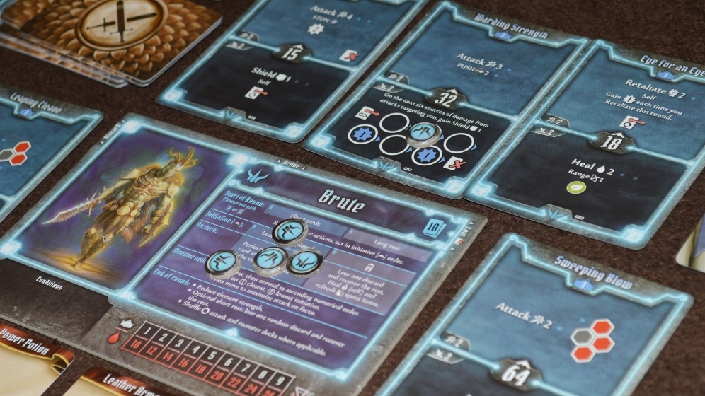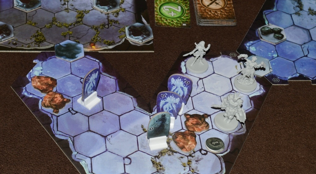 Если говорить о разнообразии сценариев, то пока мы видели лишь два типа заданий: убить всех или “залутить” сундуки. Как видно, фотографии тоже особой сменой декораций не блещут: герои то на коричневом фоне, то на синем, то на зелёном. Меняются лишь типы врагов и их количество. Но в этом и суть игры – освоить собственную колоду и найти правильный подход к любому монстру. В плане тактических решений, планирования действий и командной работы тут всё на высоте. Хотя по однотипным тайлам и жетонам на подставках так сразу и не скажешь.