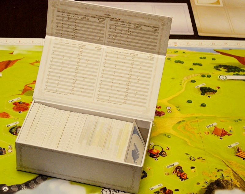 Во-первых, львиная доля победных очков зарабатывается именно за счёт наклеивания новых зданий и вскрытия “ящиков”. Во-вторых, карточки требований короля уже со второй партии развивают определённую сюжетную линию, вводя новые правила и компоненты. Ну, и в-третьих, не обойдётся без парочки неожиданных сюрпризов – пока это запрятанные на дне коробки тайлы островов, но уверен, что будет ещё что-то крутое.
