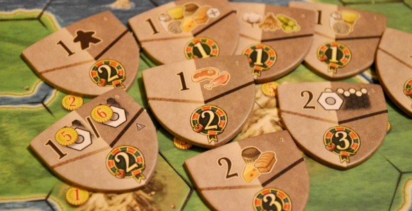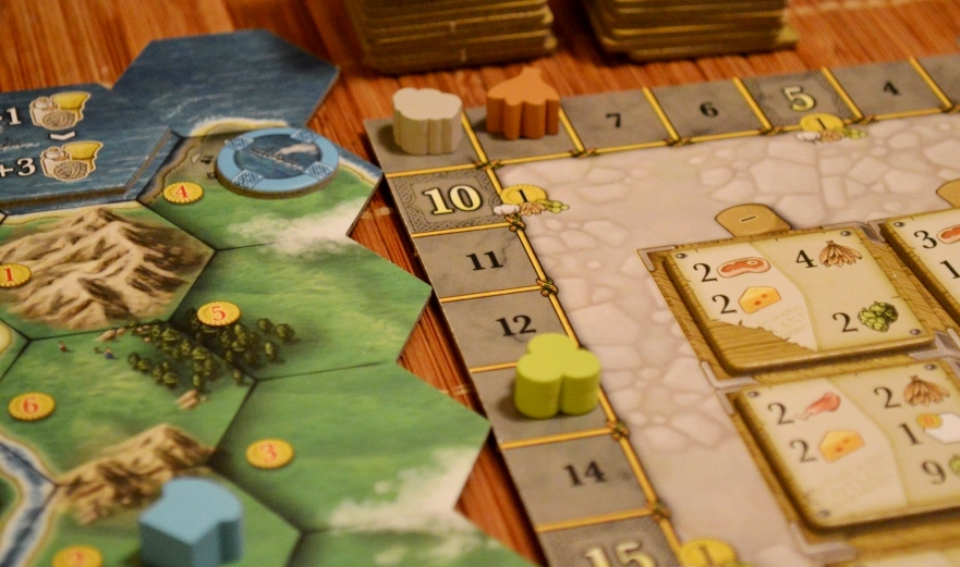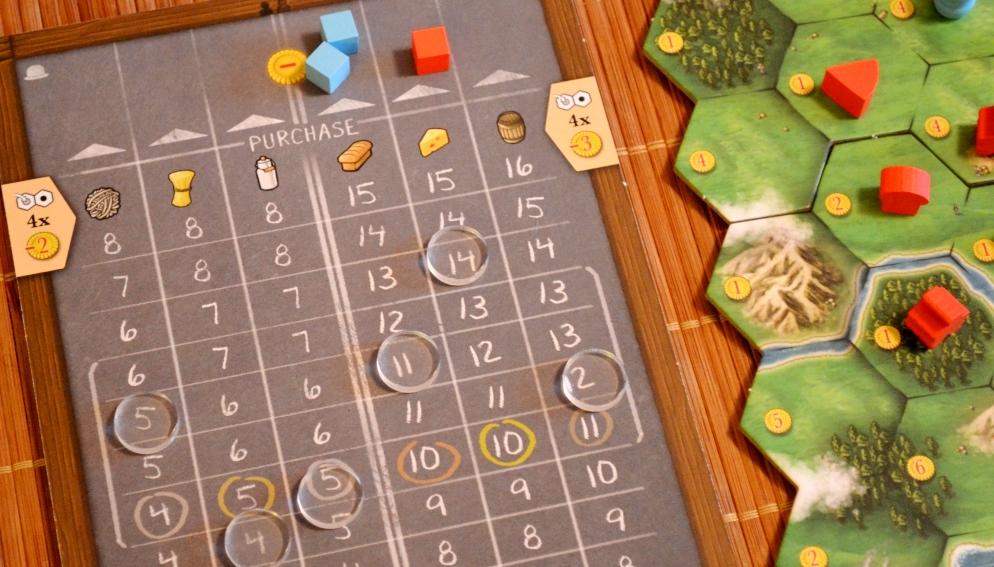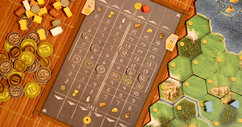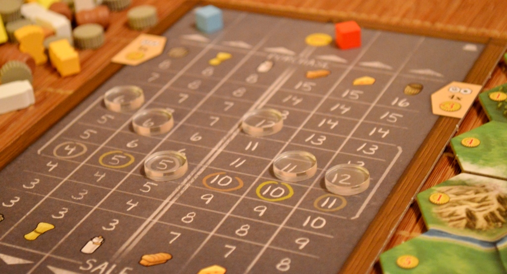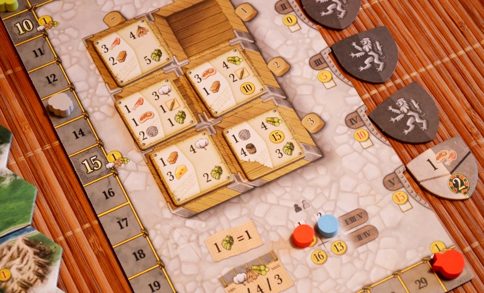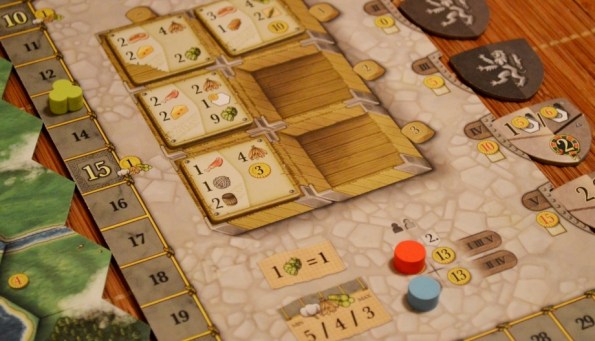 Для меня рынок стал настоящим открытием не только за счёт спекуляций, но и ограничений – вы можете провернуть сделку только, если у вас есть свободный кубик торговца. Причём это касается и бонуса за строительство рядом с соперниками. Вдобавок игрок не может в одном и том же раунде купить товар, взвинтить стоимость и тут же его продать. Рынок заставляет постоянно следить за колебанием цен и выжидать подходящий момент для сброса излишков или, наоборот, для вложений в конкретный тип товара.