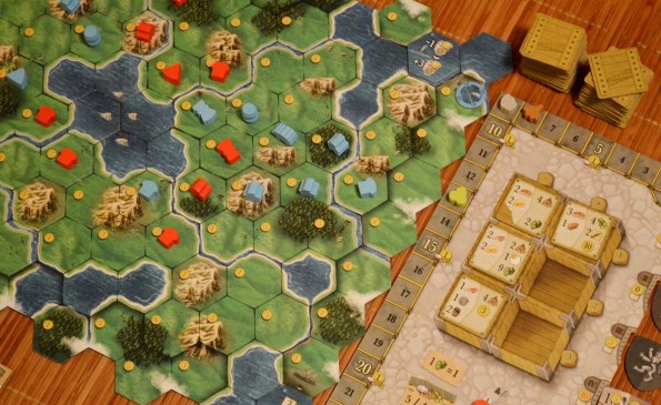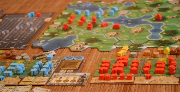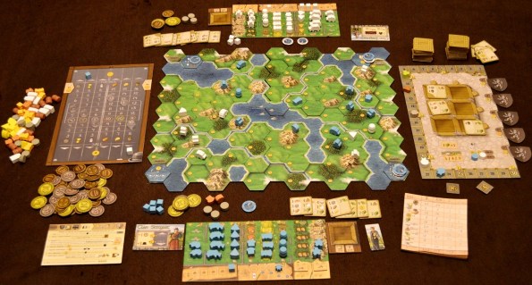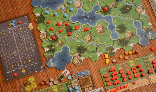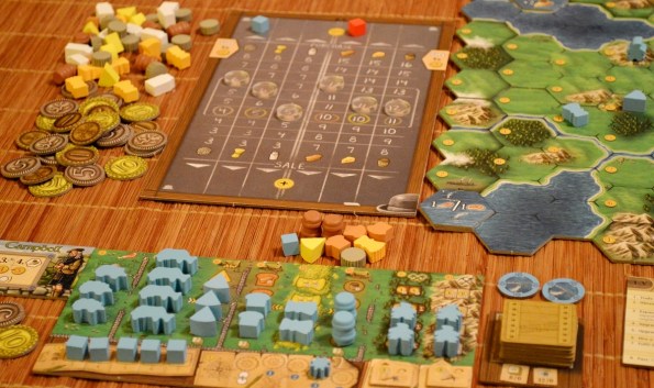 По стремительности игра напомнила Марко Поло, по планшету и экспансии – Терру, а вот благодаря рынку и экономической составляющей показалась любопытной и дающей даже какие-то новые ощущения. Раскладывается быстро, играется живенько, на двоих идёт тоже неплохо.