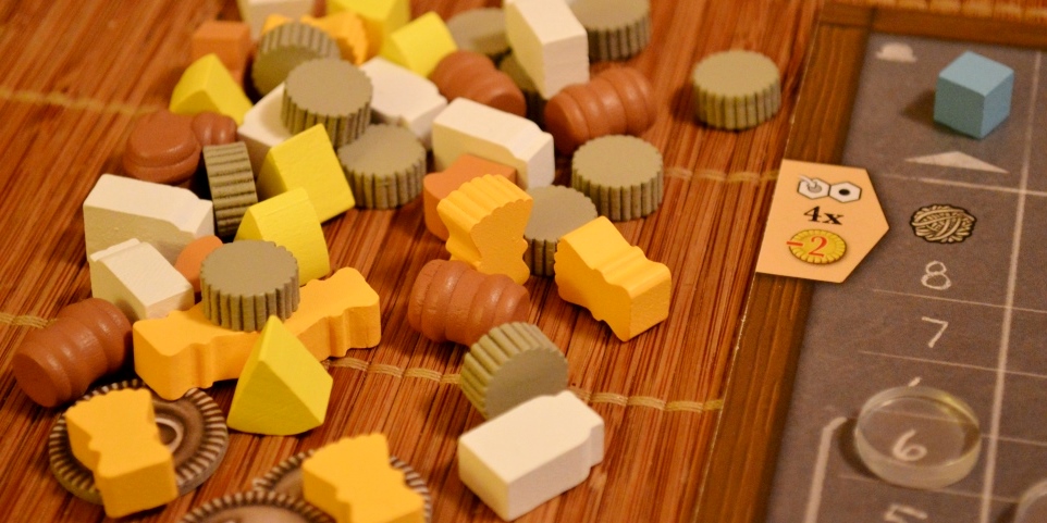 К примеру, если я хочу сбыть 2 бочки виски, то должен выставить под соответствующим треком двух торговцев. Взяв монеты, я тут же корректирую цену на виски, двигая прозрачный маркер вниз на два деления.