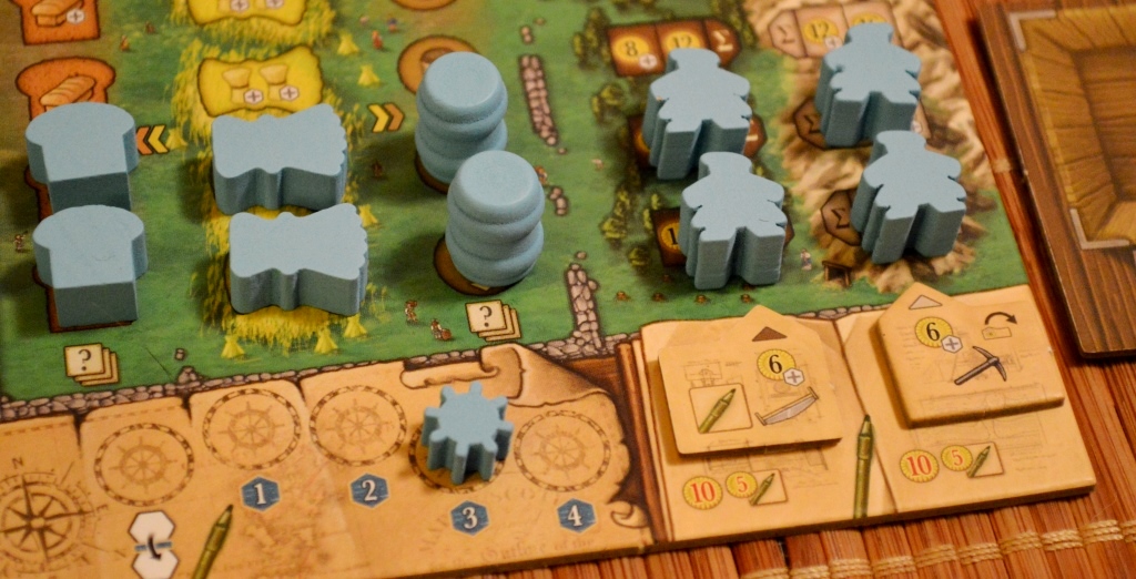 Экспансия. Берём со своего планшета фишку рабочего, скотинки или товара (последние два олицетворяют соответствующие производственные здания) и выкладываем на поле, предварительно заплатив цену, указанную не только на планшете, но и на гексе, куда оно размещается.