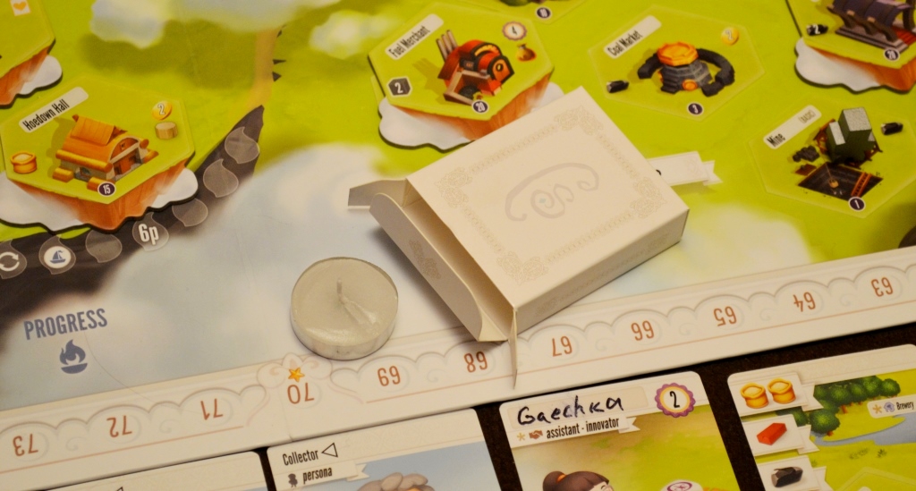 Но самое забавное, что произошло (и что было действительно прикольно обыграно) – это момент со свечкой. Да, вы не ослышались. Король был недоволен, что к концу партии мы не зачистили свои владения от кубиков опасностей (проворонили одну локацию), и решил нас навестить. В качестве задания мы должны были закончить приготовления к его визиту, пока горит свеча. На чьём ходу она затухнет, тот не получит бонусной звёздочки.