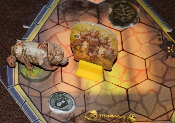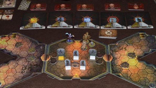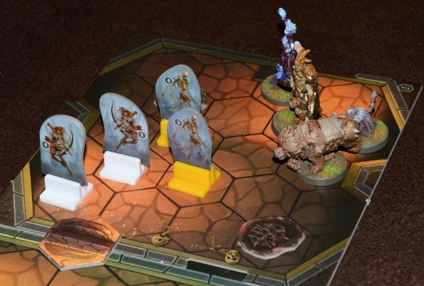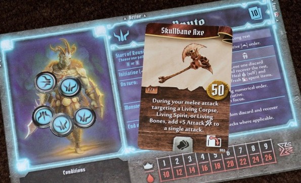 Другой позитив – мы налепили первые наклейки на карты действий. Я себе за 30 золотых взял +1 к pierce (чем дальше, тем этот показатель важней), а маг за 50 – +1 к атаке. Пока возился с этими мелкими наклейками, проверил насколько они removable (работает!). Причём не специально. Так волновался, что свою налепил не на ту строку.