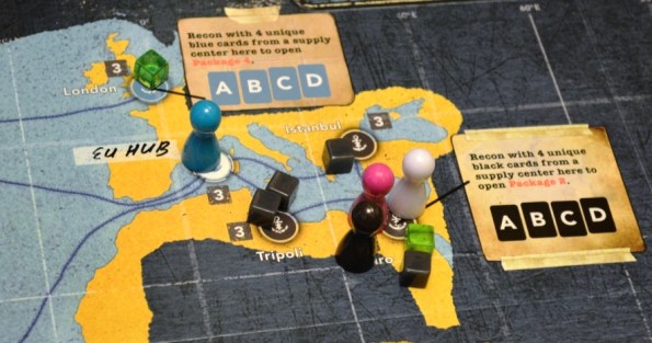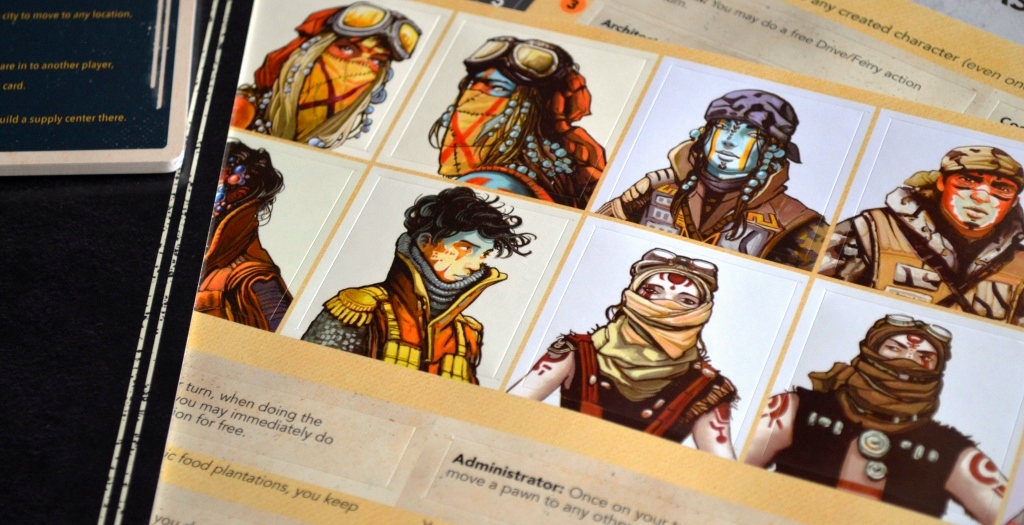 Для более эффективного менеджмента серых кубов в арсенал героев добавились новые действия. Помимо уже знакомых (передвижение в соседнюю локацию, “перелёт” за карточку города – только тут это переправа по воде, передача карты товарищу) игрок может взять один кубик запасов из резерва и положить на карточку персонажа; перекинуть любое число кубиков со своей карточки в город, где он находится; построить станцию, сбросив с руки пять карт такого же цвета, что и город; а также совершить разведку (об этом ниже).