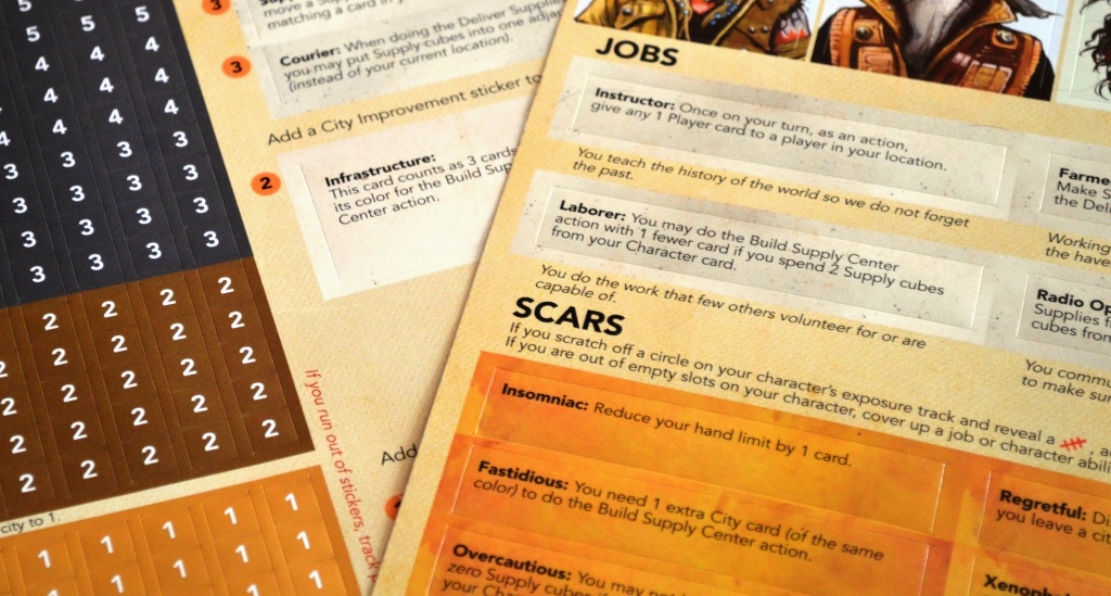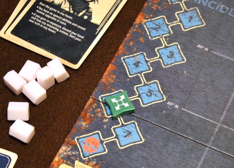Также, когда игрок начинает ход в городе с зелёным кубиком, с ним тоже случается беда. В этом случае игрок стирает отметку на треке заражения в нижней части карточки персонажа, где может быть уже знакомый “шрам” или даже смерть.