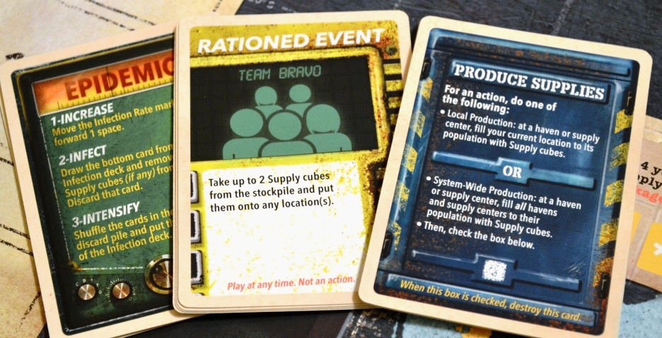 Напомню, что второй сезон представляет собой “пандемию наоборот”. Теперь вместо снятия кубиков болезней игрокам следует добавлять серые кубики запасов, которые помогут городам бороться с эпидемией. При вытаскивании карточки города местные жители “потребляют” один такой кубик и тем самым сдерживают распространение заразы.