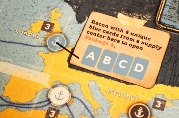 Кстати, в колодах каждый город представлен сразу несколькими картами, что усложняет контроль над запасами. С другой стороны, в геройской колоде добавлен новый тип карт снабжения с двумя вариантами действий. Верхнее позволяет восполнить запасы в гавани или городе со станцией до максимума (циферка рядом с локацией, обозначающая уровень населения). С помощью же нижнего действия можно раскидать серые кубики по всем гаваням и станциям. Правда, придётся поставить на карте крестик. Если места под крестики заканчиваются, то карта убирается из игры навсегда (или рвётся!).